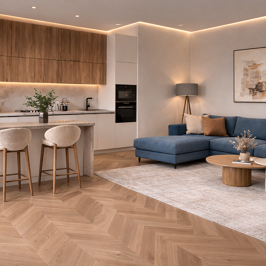 The Contemporary Blue Accent Scheme was developed for this affordable residential housing project in Walsall, Birmingham, to create interiors that feel modern, comfortable, and visually distinctive. The design combines warm timber finishes, soft neutral tones, and carefully placed blue accents to introduce character while maintaining a calm and practical residential environment.