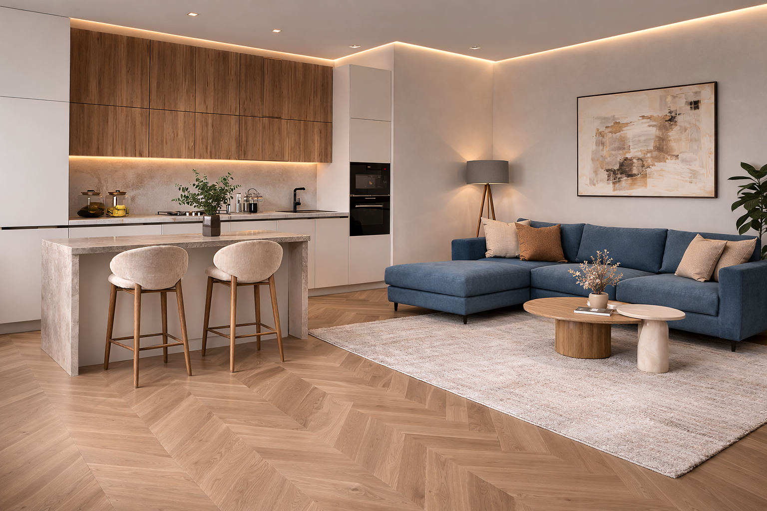 The design concept centres on contemporary simplicity with a stronger visual identity. Neutral finishes provide the foundation of the scheme, while timber-effect materials introduce warmth and texture. Blue accents in the upholstery and styling elements bring contrast and a more defined modern character to the living and bedroom spaces.