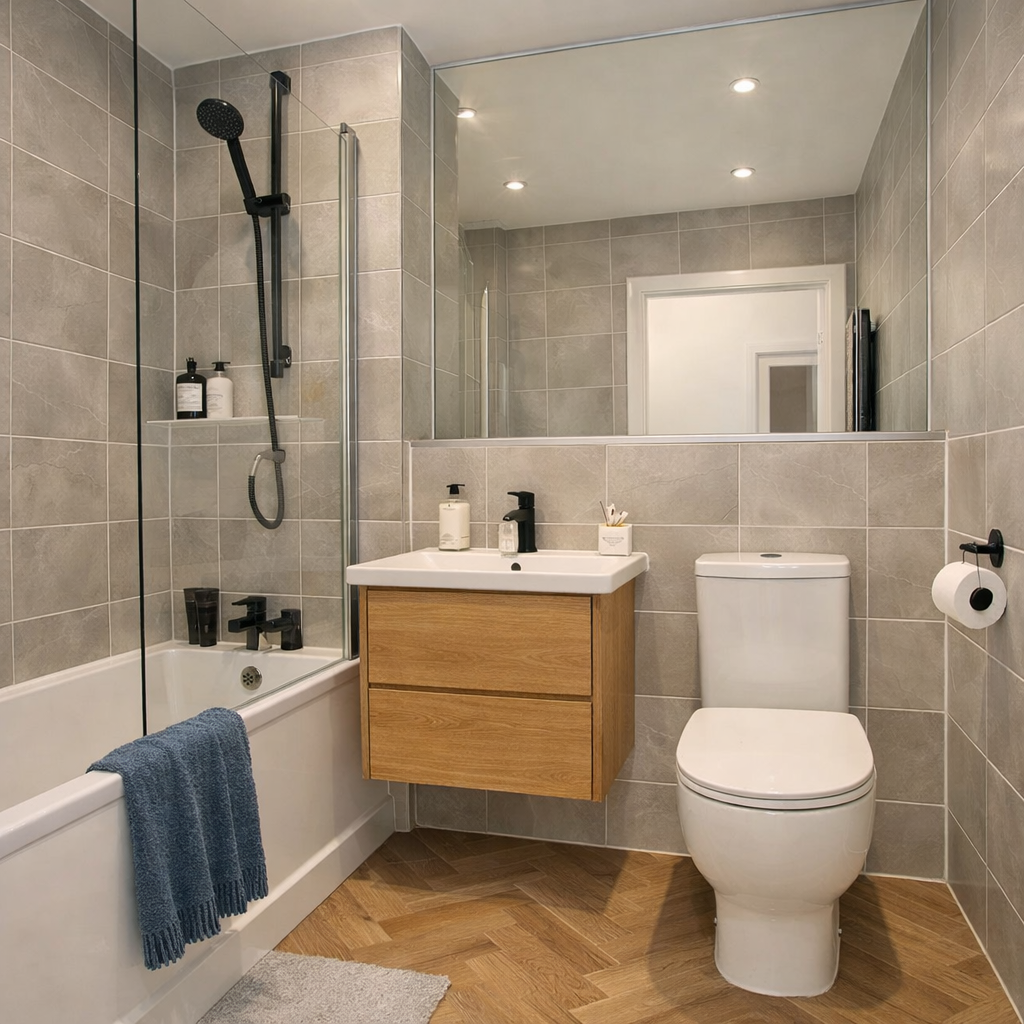 The bathroom follows a clean and practical contemporary language, using modern fittings, neutral tiling, and compact storage to support everyday use while maintaining consistency with the rest of the interior.