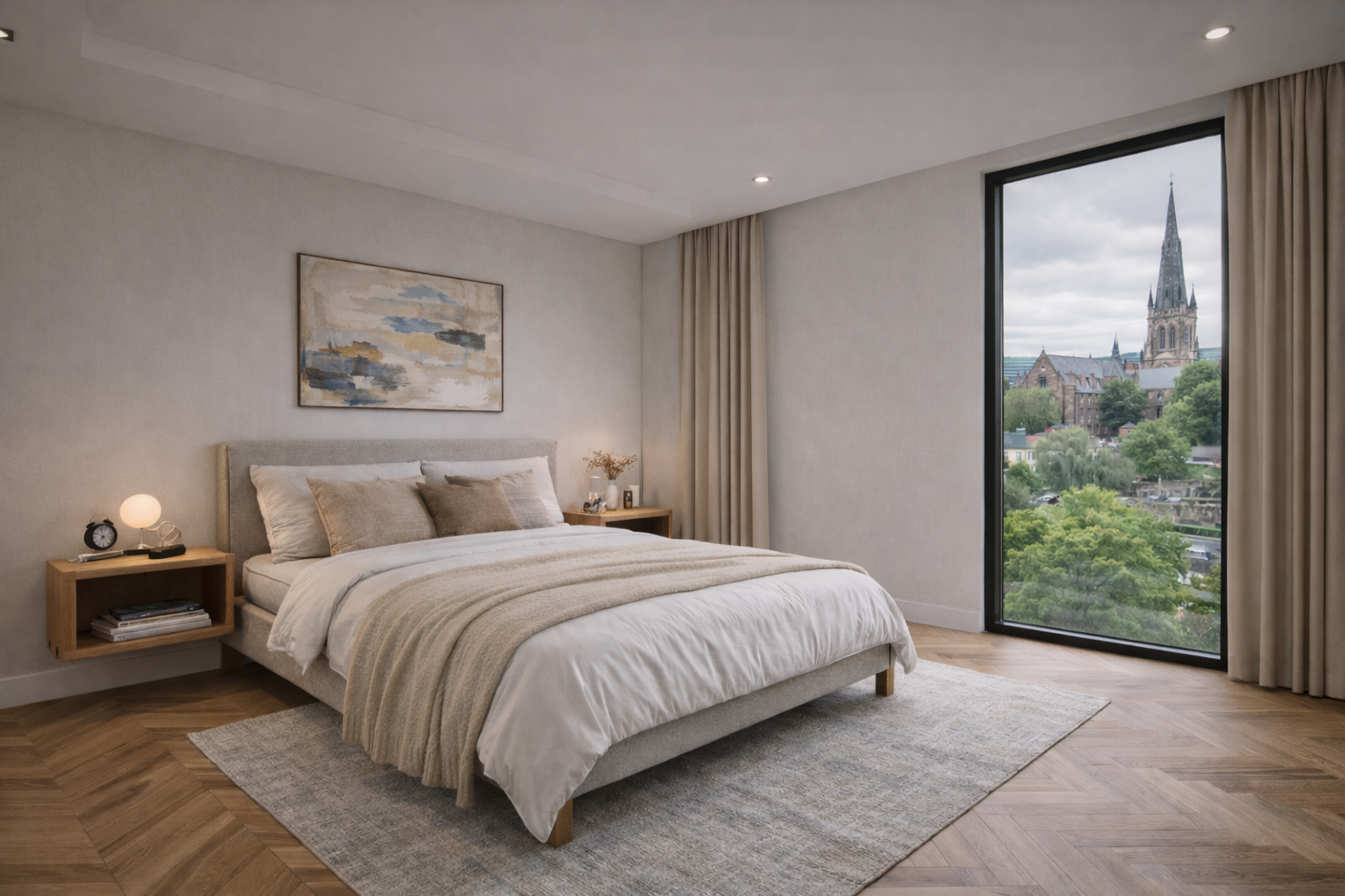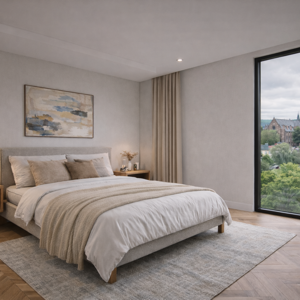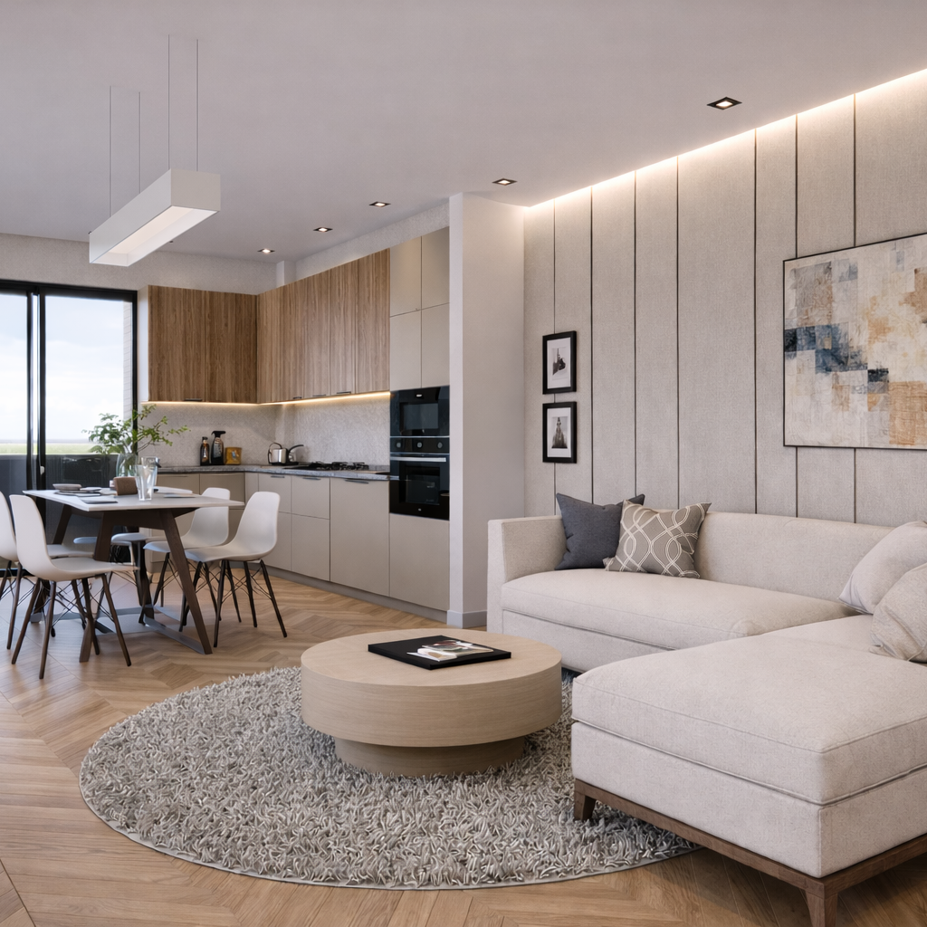 The Refined Contemporary Living Scheme was developed for this affordable residential housing project in Walsall, Birmingham, to create interiors that feel calm, modern, and highly liveable. The design combines soft neutral tones, warm timber finishes, and clean contemporary detailing to deliver a balanced residential environment that supports both comfort and practicality.
