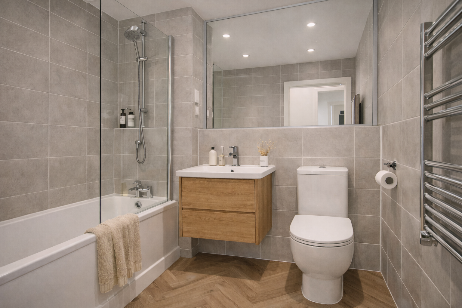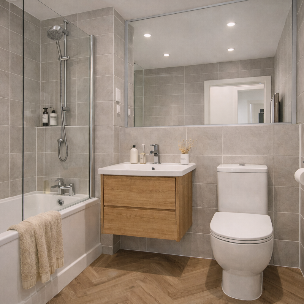 Bedrooms are styled to feel restful and bright, with soft textiles, understated artwork, and a restrained material palette creating a comfortable and contemporary atmosphere. The bathroom follows the same design language with durable grey-toned tiling, simple sanitaryware, and practical storage solutions that support both ease of maintenance and visual consistency.