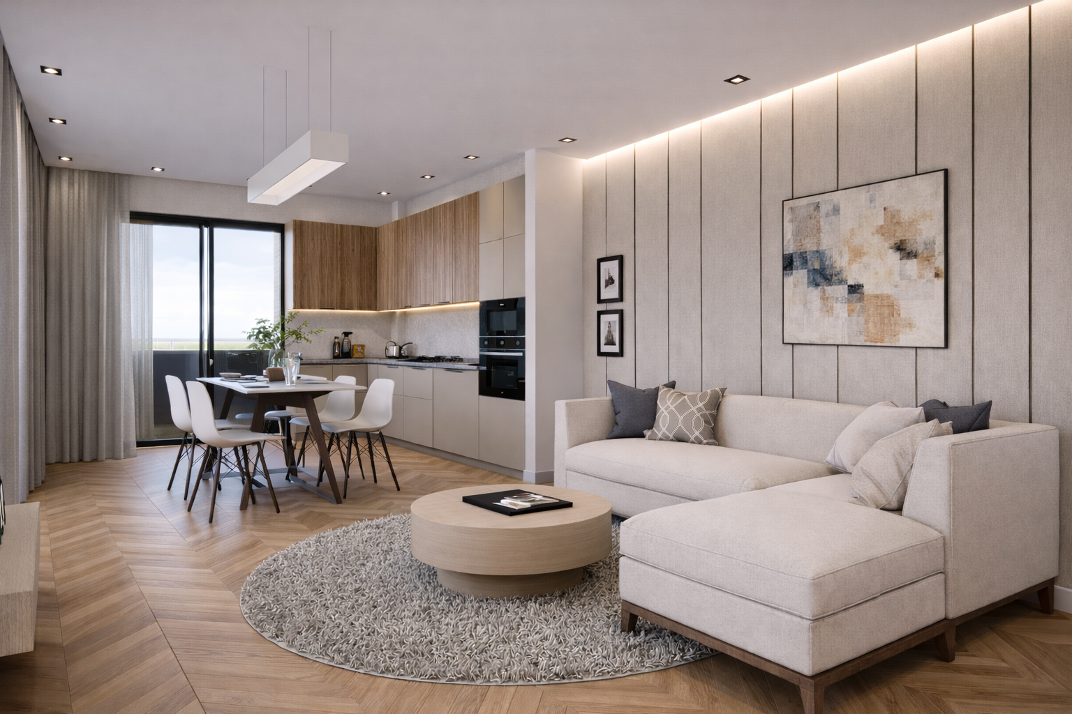 The living area has been designed to feel comfortable and cohesive, with balanced proportions, modern furniture layouts, and subtle decorative features that enhance the overall sense of quality. The kitchen continues this approach through a combination of timber-effect and muted cabinetry, integrated appliances, and practical surfaces that support daily use while maintaining a streamlined visual finish.
