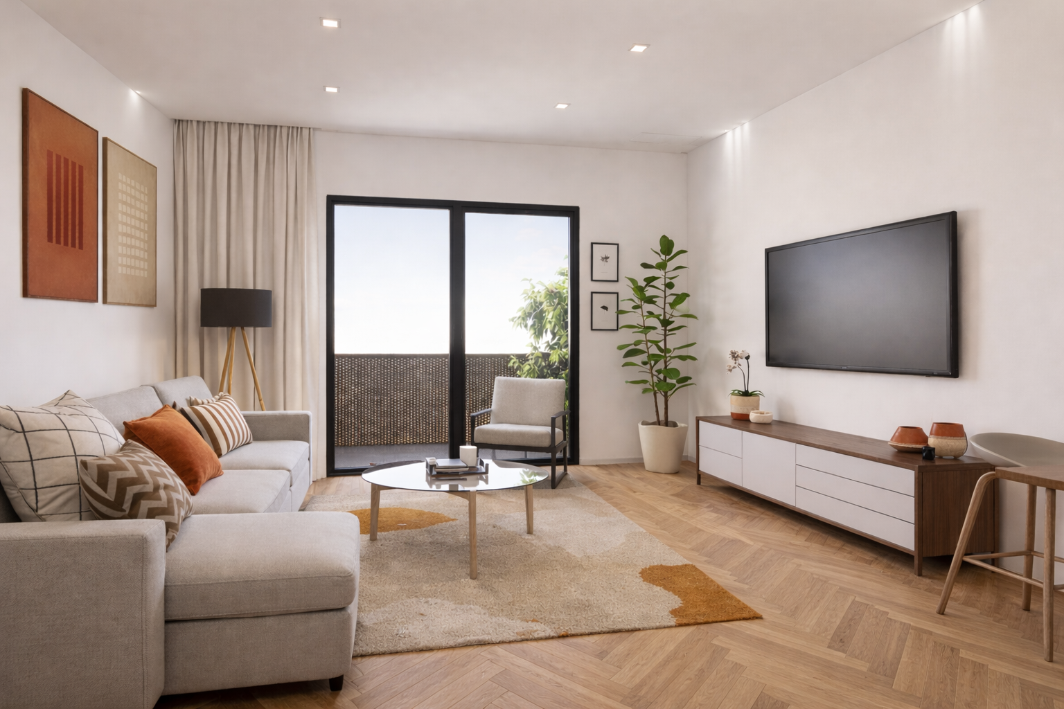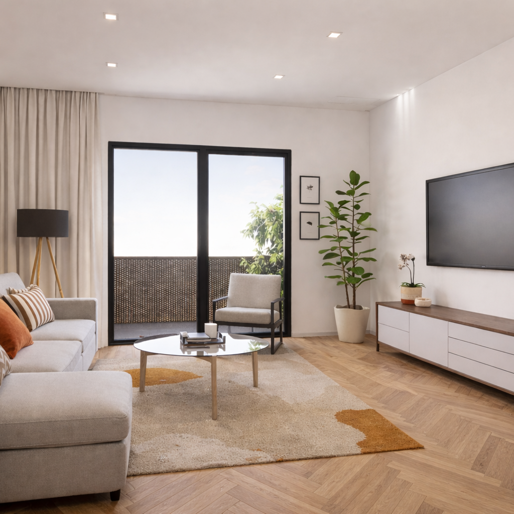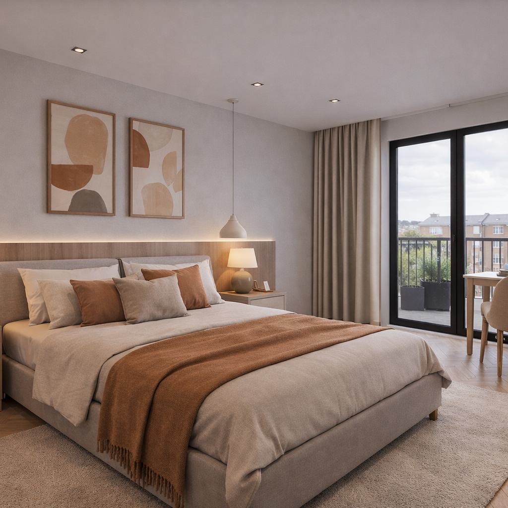The Warm Neutral Living Scheme was developed for this affordable residential housing project in Walsall, Birmingham, to create interiors that feel bright, comfortable, and immediately welcoming. The design combines soft natural tones, light timber finishes, and practical modern detailing to deliver a calm and cohesive living environment suited to contemporary everyday life.