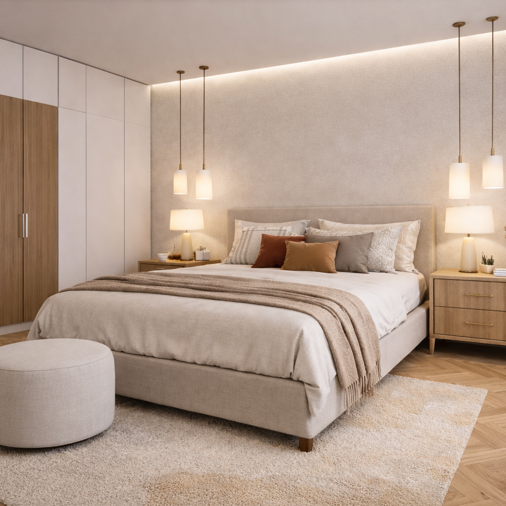 The design concept centres on warmth, softness, and modern simplicity. A palette of warm neutrals, natural timber tones, soft beige finishes, and subtle terracotta accents creates a more welcoming and residential character throughout the home.