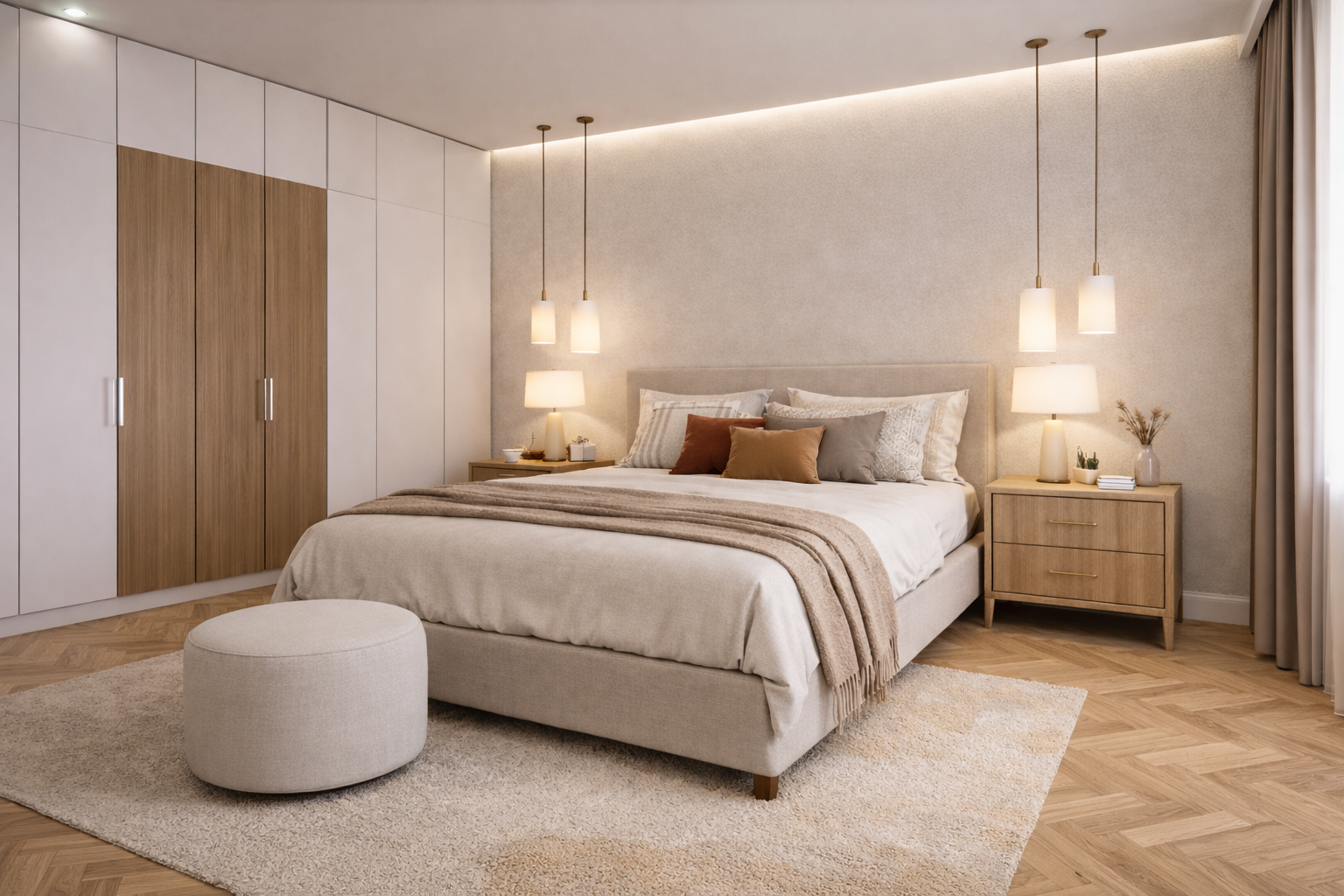 The living areas have been designed to feel open and relaxed, with light finishes and balanced furniture layouts helping to enhance comfort and visual clarity. The kitchen combines clean contemporary joinery with timber-effect detailing to create a practical yet inviting centre for daily life. Bedrooms continue this language with soft layered textures, warm accent tones, and understated lighting that support a restful and comfortable atmosphere.