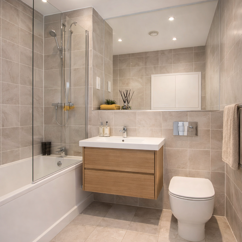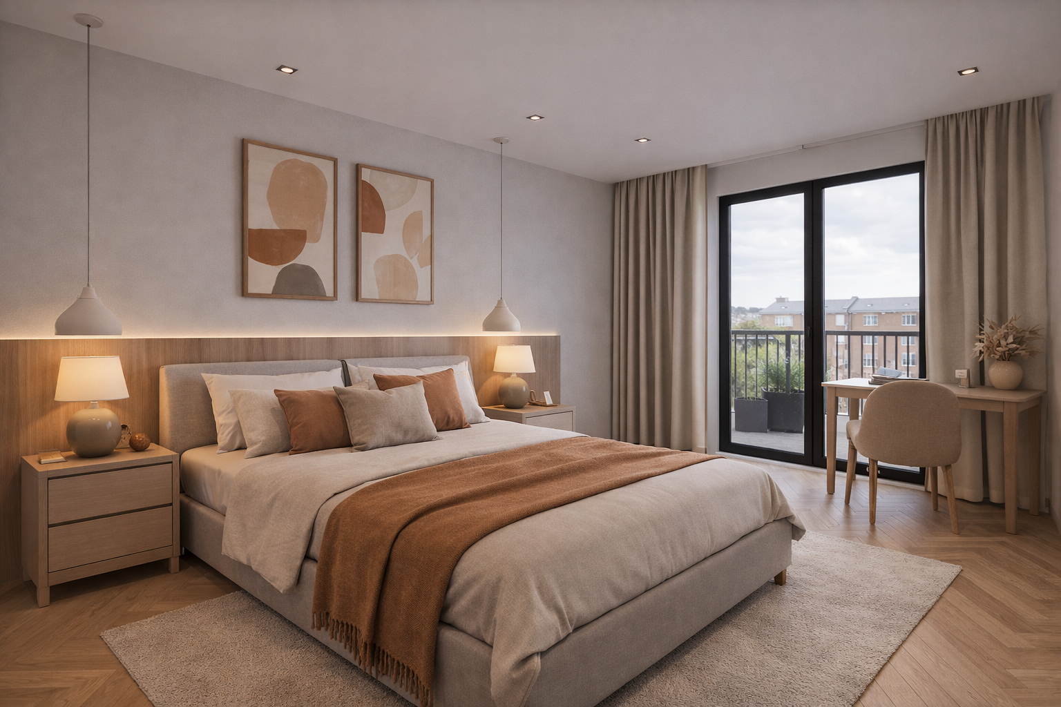The scheme has been carefully planned to balance affordability with visual quality, ensuring that each room feels modern, attractive, and highly functional. Warm timber-effect flooring, neutral cabinetry, layered textures, and soft lighting all contribute to a home that feels relaxed, practical, and easy to live in.