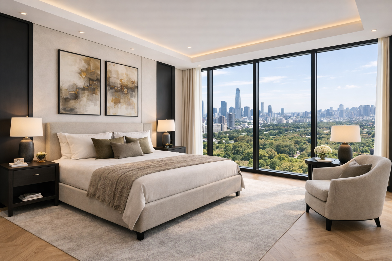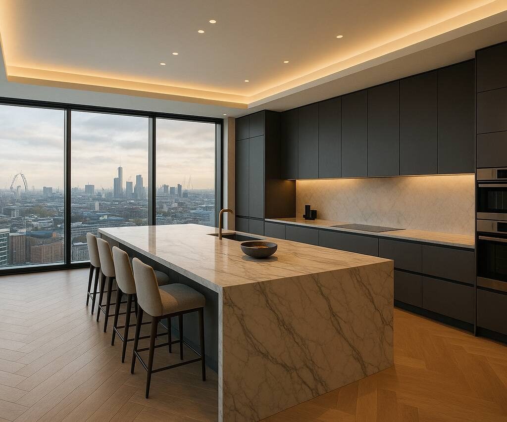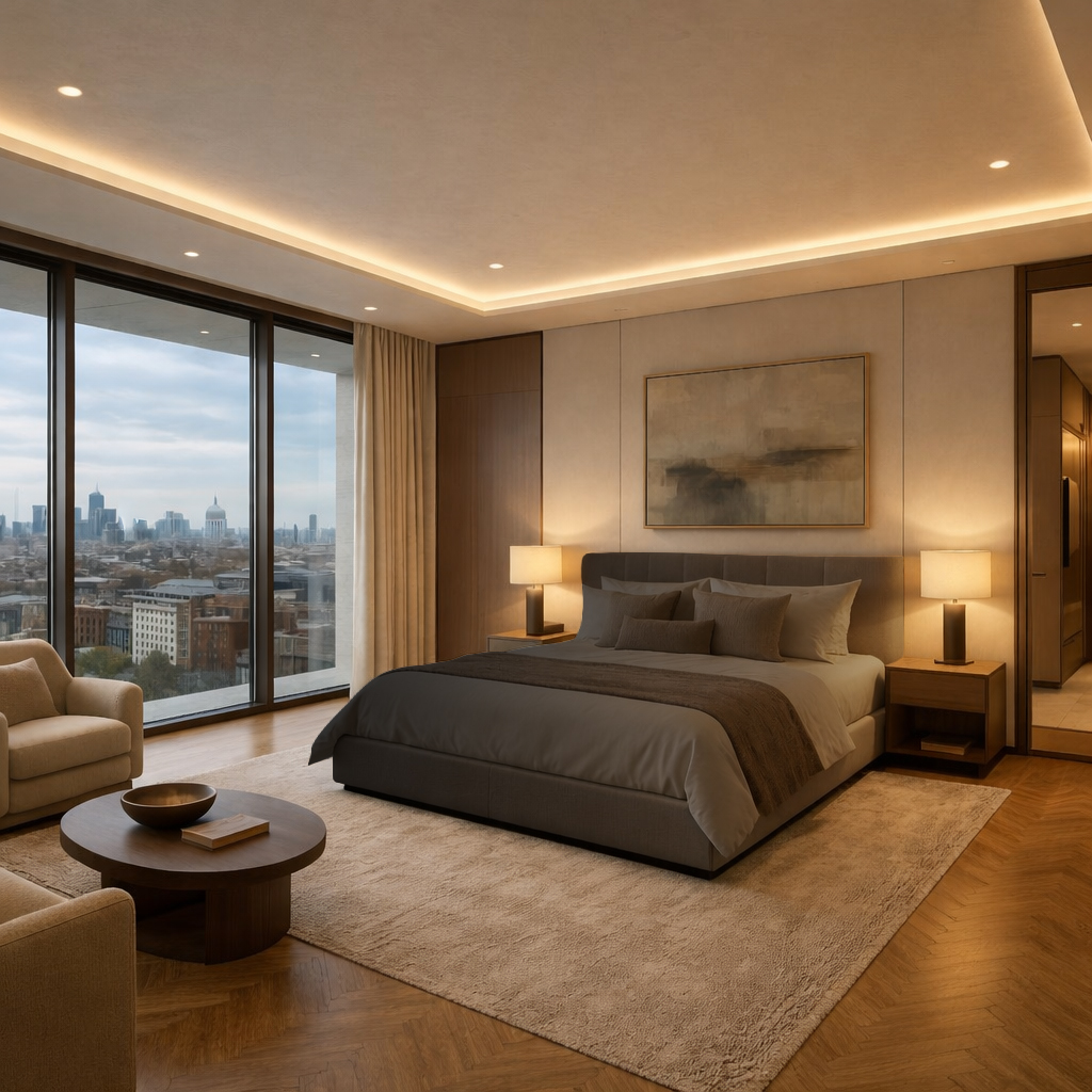 This luxury residential fit-out project in Nine Elms delivers a sophisticated contemporary interior designed around comfort, elegance, and panoramic London living. The scheme combines premium finishes, bespoke joinery, and carefully balanced lighting to create a refined home with a calm and modern atmosphere.