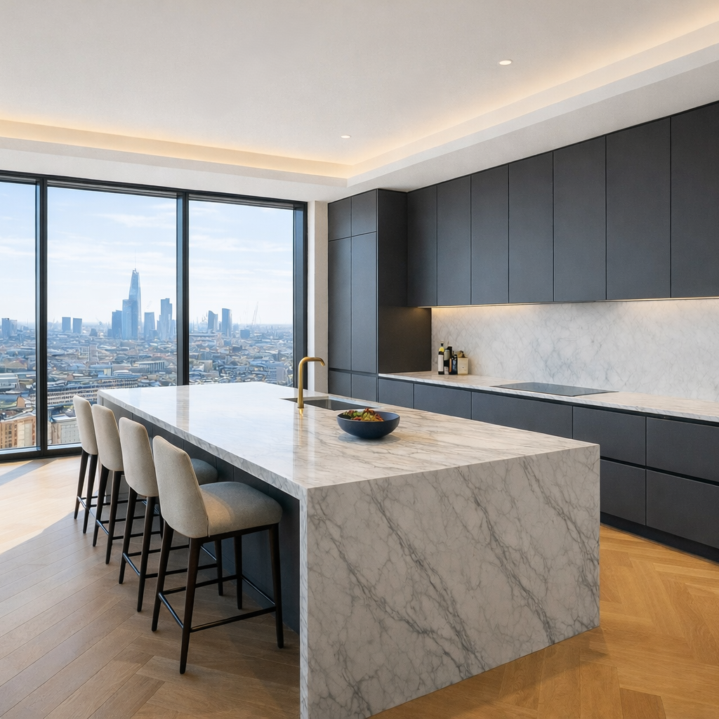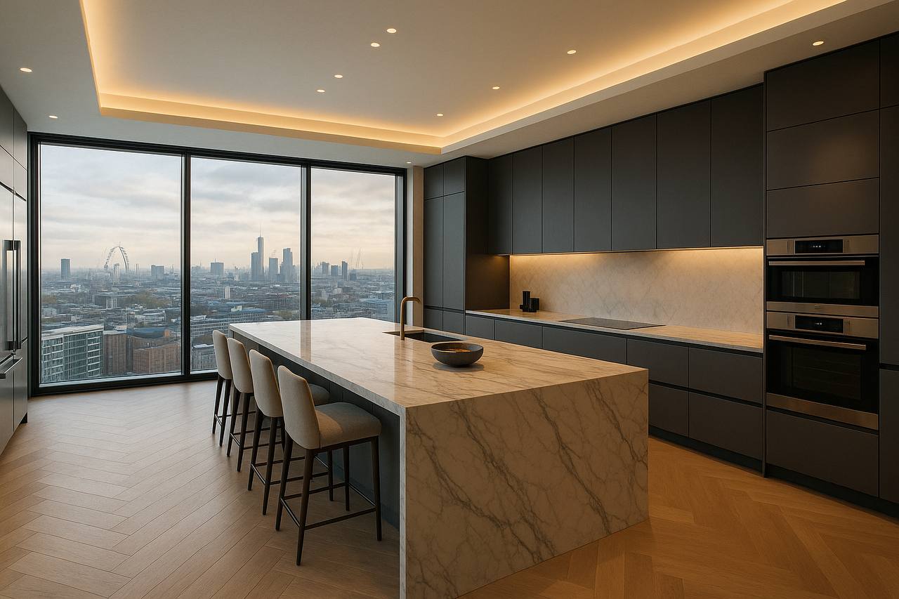 From the open-plan living spaces to the statement kitchen, refined bedrooms, and luxury bathroom, the project reflects a high-end residential design and build approach tailored to modern city living in Nine Elms.