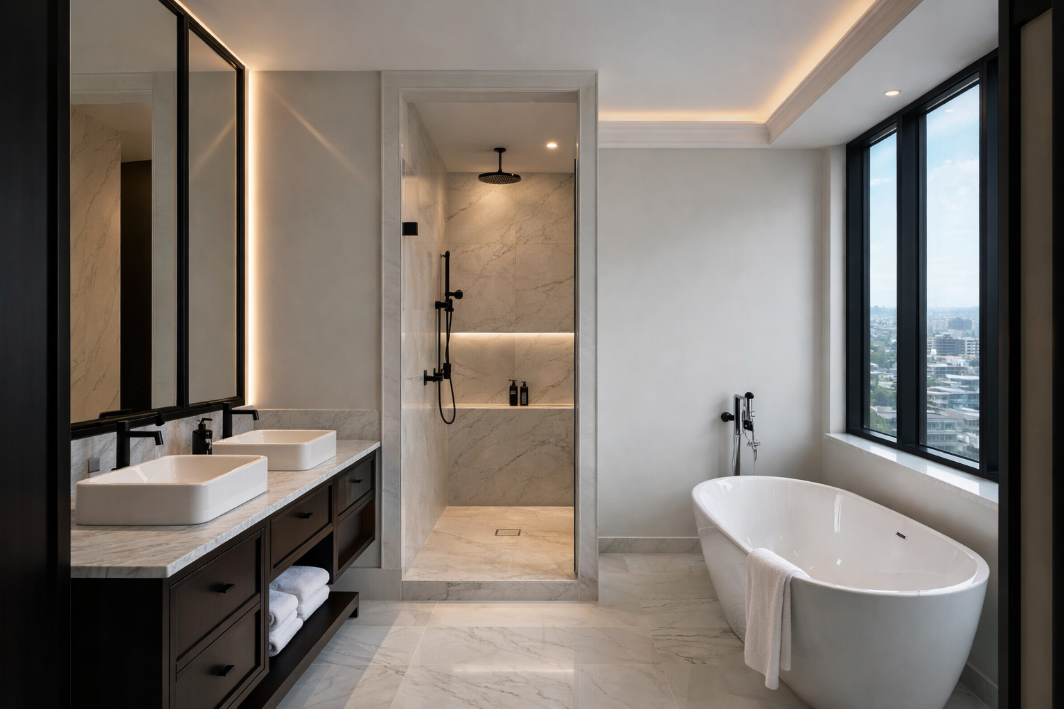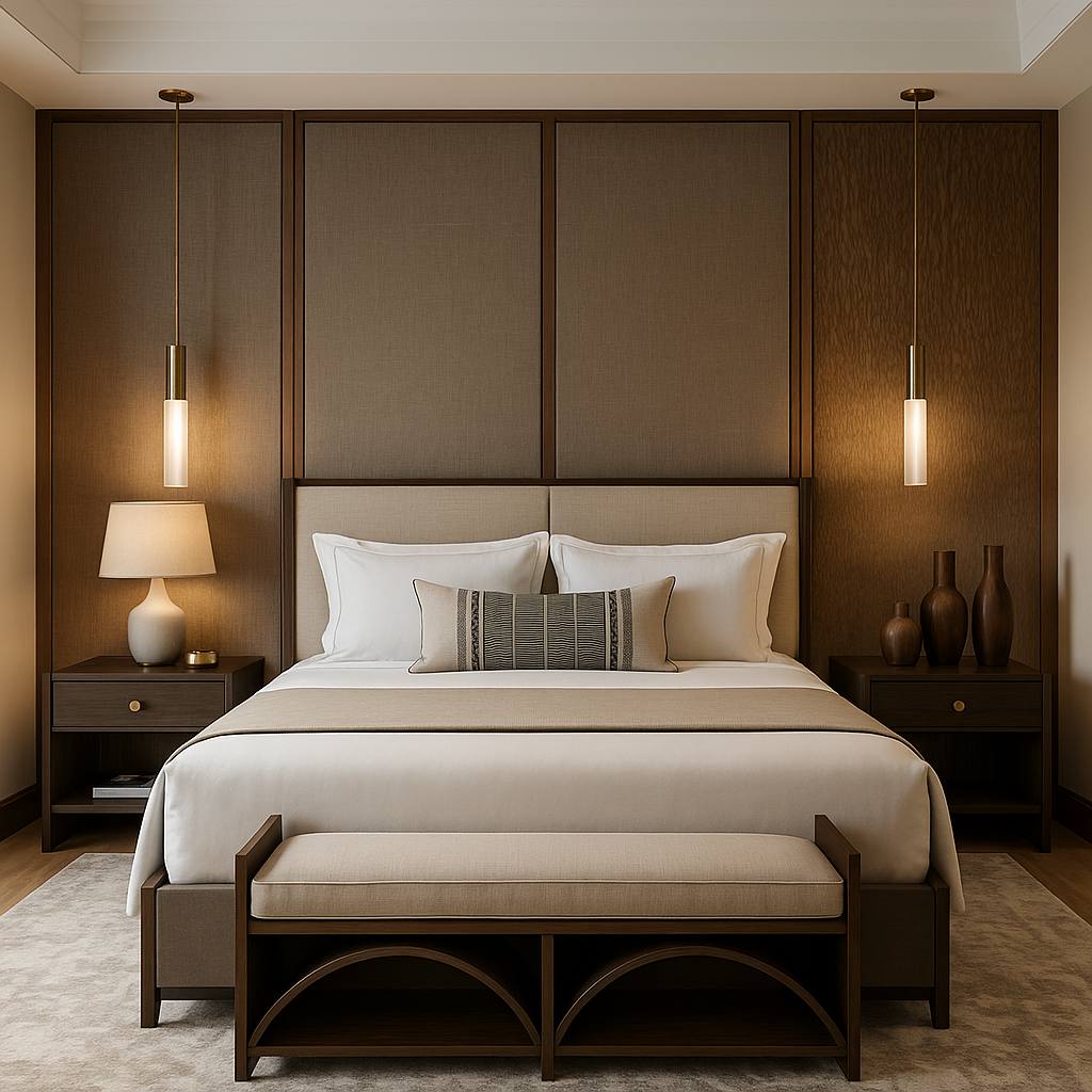 The interior design concept is centred on understated luxury, clean architectural lines, and a warm contemporary palette. Full-height glazing, dark timber wall panelling, marble surfaces, integrated lighting, and tailored furniture selections create a strong visual identity throughout the home.