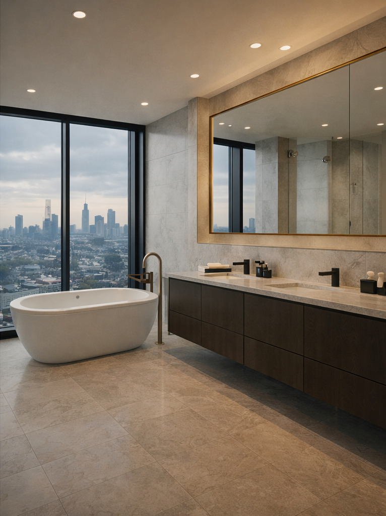 The project has been developed to maximise natural light, skyline views, and interior flow throughout the property. Warm timber tones, stone surfaces, soft furnishings, and full-height glazing work together to create a polished and highly liveable environment.