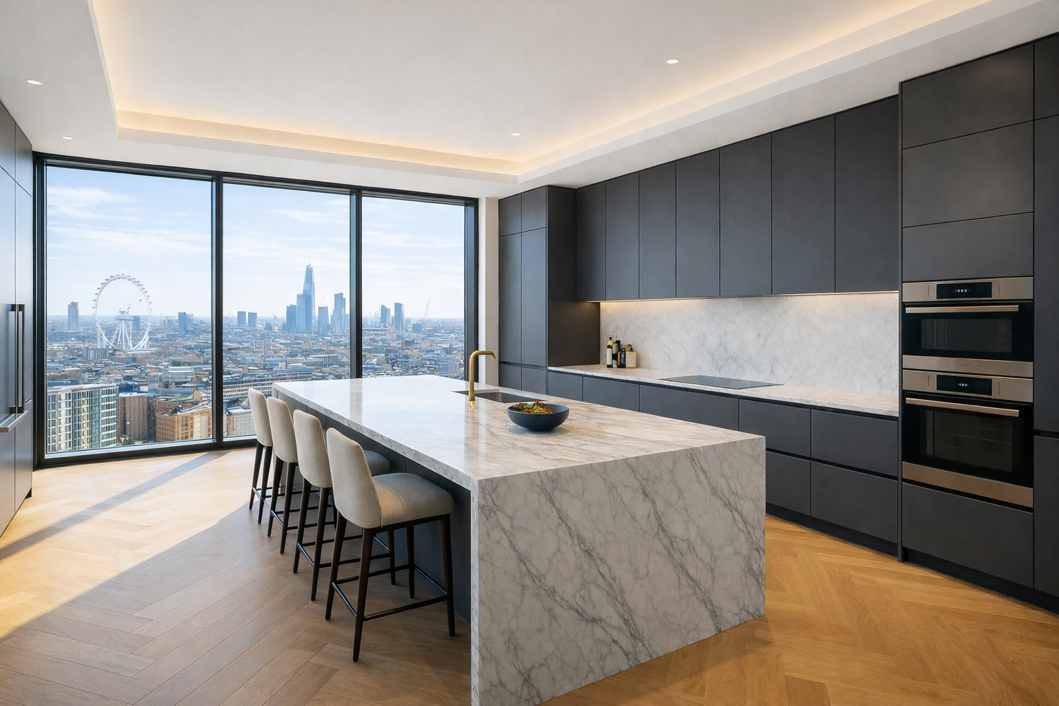 The result is an elegant interior language that supports both comfort and visual clarity, while making full use of the property’s impressive views across London.