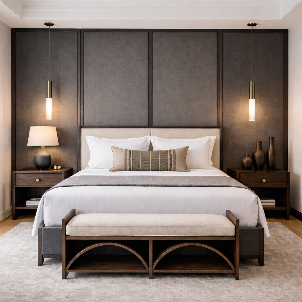 Each room has been designed to feel seamless and cohesive, with a restrained palette that allows texture, proportion, and material quality to define the experience of the space. The combination of soft neutral tones and darker feature elements adds depth, contrast, and a sophisticated modern character.