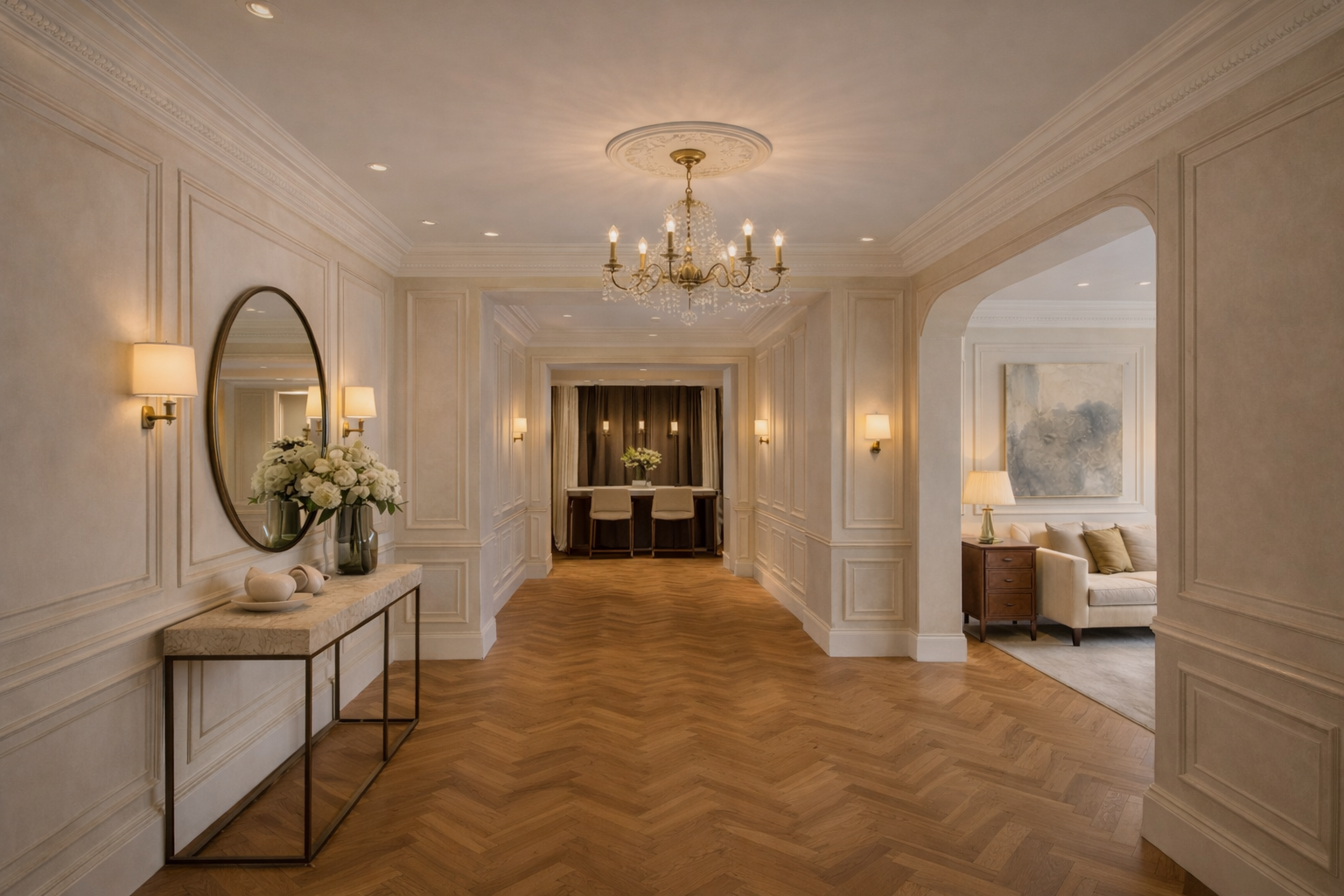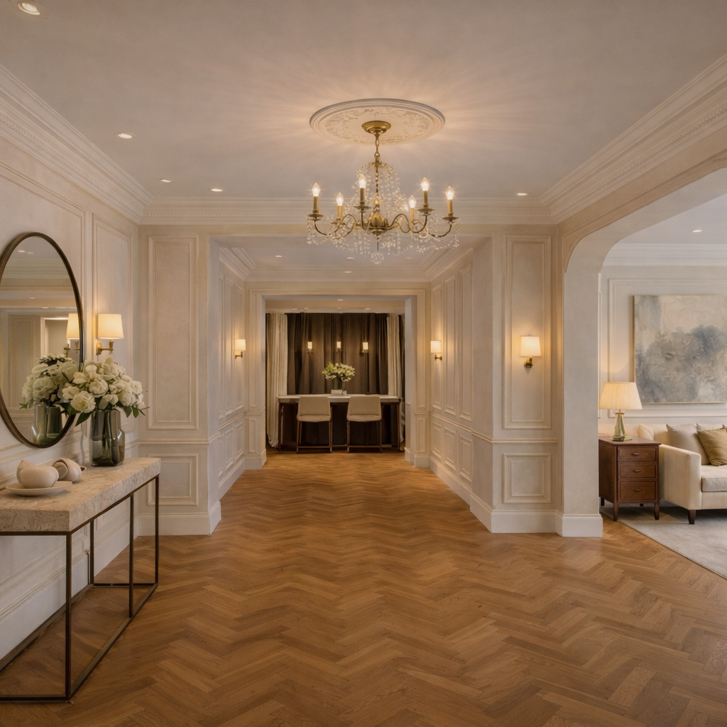 The interior design approach balances timeless elegance with modern practicality. Decorative wall panelling, refined ceiling detailing, statement lighting, and premium finishes establish a strong visual identity throughout the property.