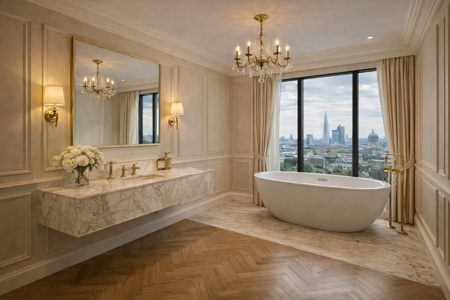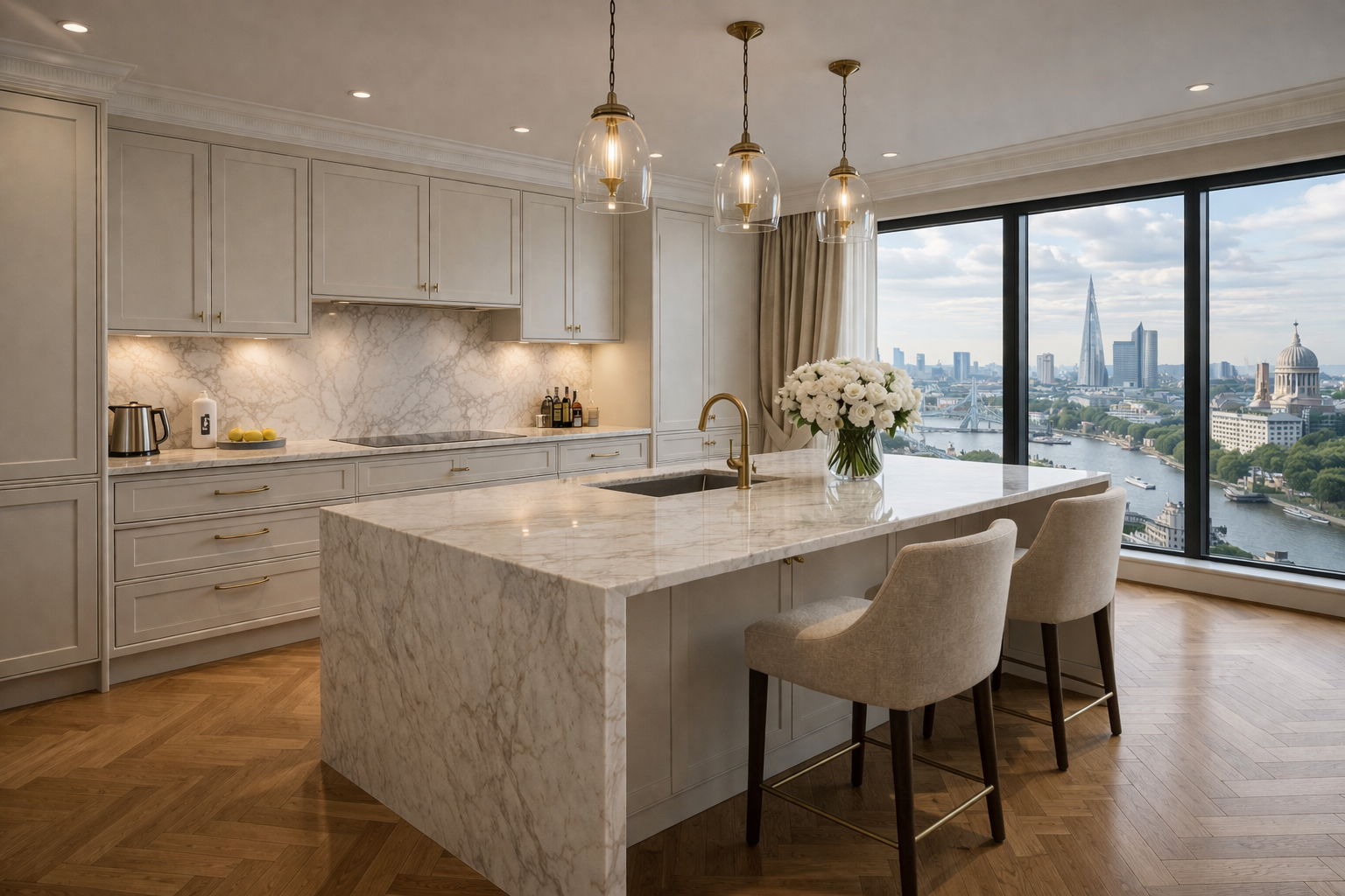 Soft neutral tones have been used to enhance warmth, light, and visual harmony, while large windows frame panoramic views across the City of London skyline. The design creates an atmosphere that feels tranquil, luxurious, and connected to its surroundings.