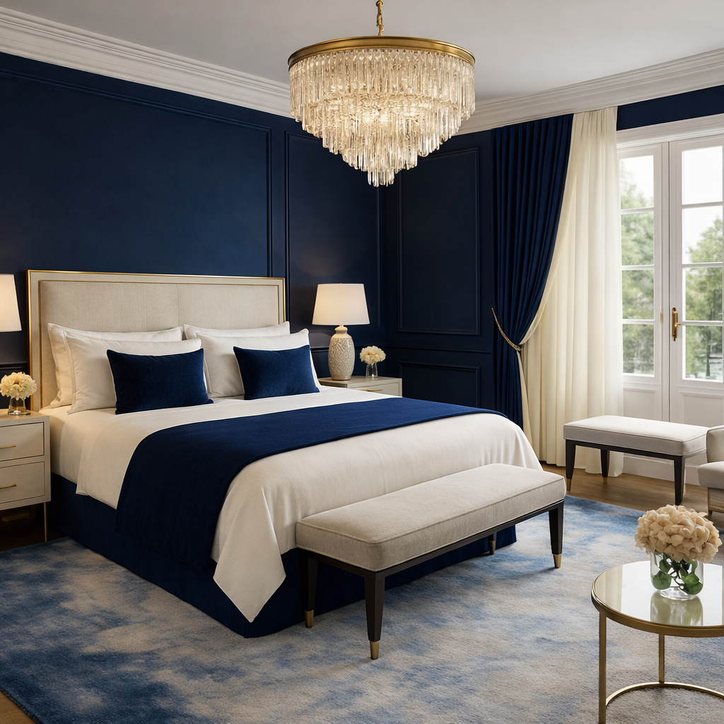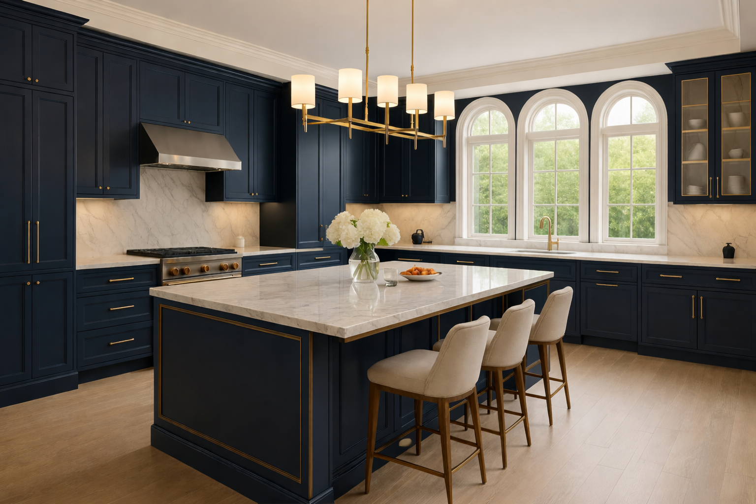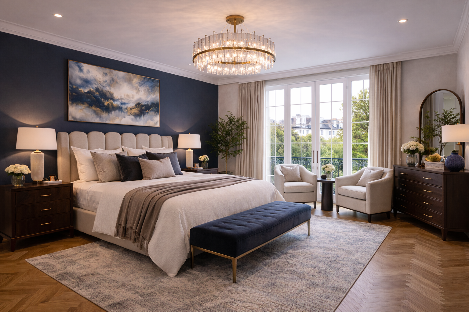 The design concept is centred on contemporary classic luxury, combining traditional proportions with modern comfort and carefully selected finishes. Deep navy cabinetry, brushed brass details, decorative wall panelling, elegant chandeliers, and soft neutral furnishings establish a strong yet timeless visual identity across the home.