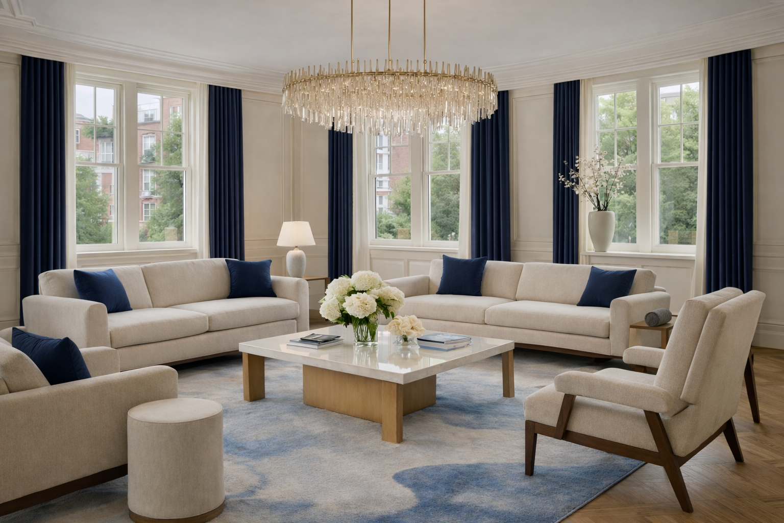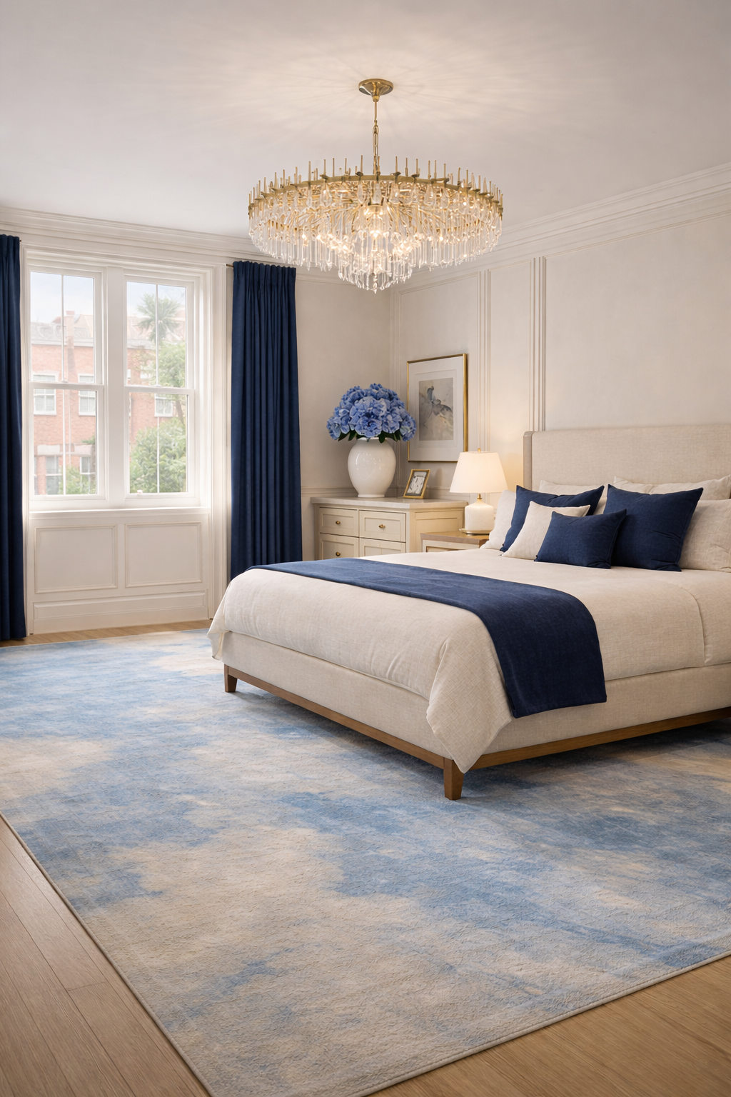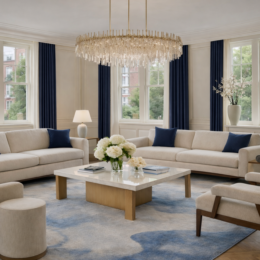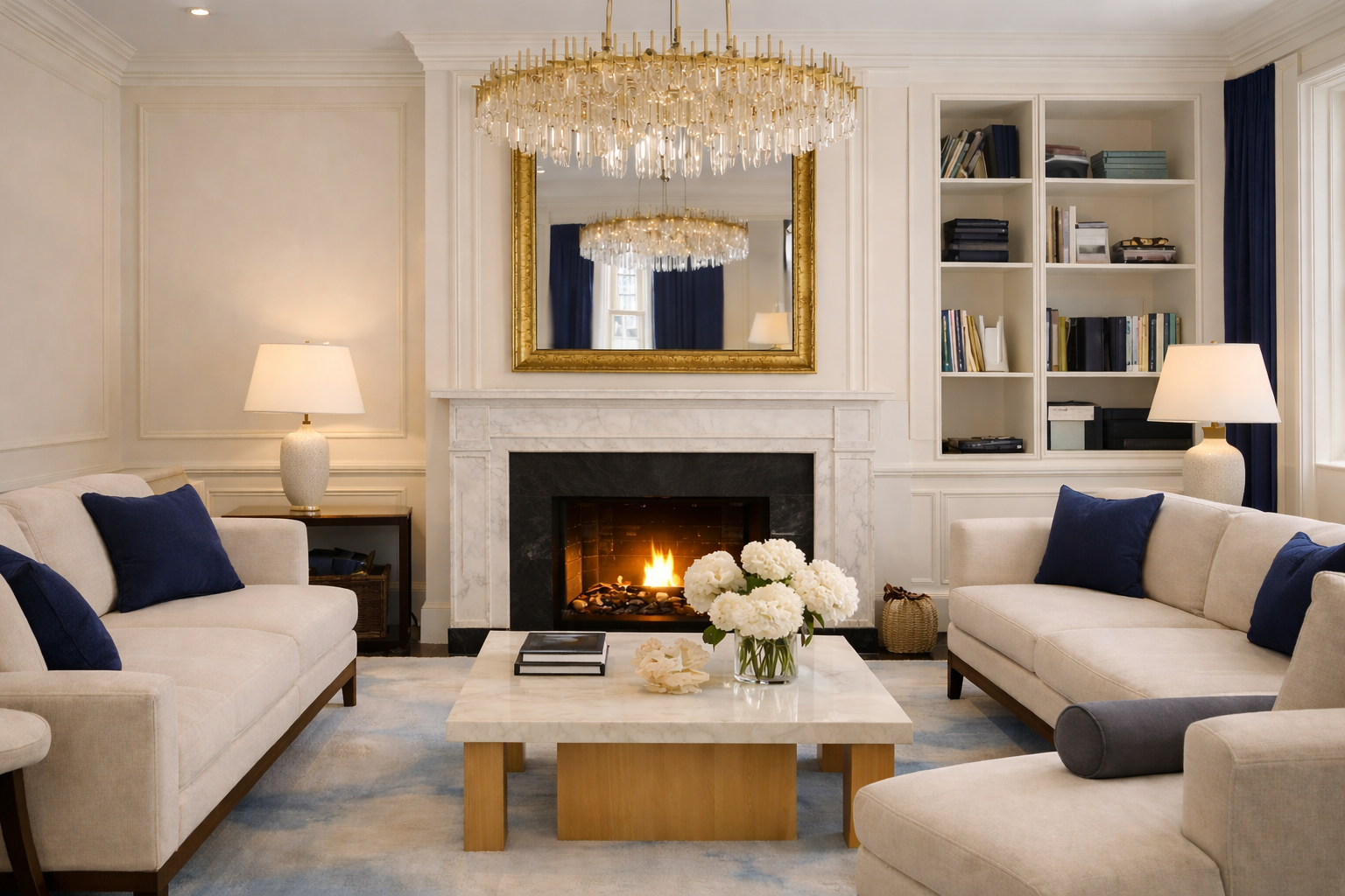 The design concept is centred on contemporary classic luxury, combining traditional proportions with modern comfort and carefully selected finishes. Deep navy cabinetry, brushed brass details, decorative wall panelling, elegant chandeliers, and soft neutral furnishings establish a strong yet timeless visual identity across the home.