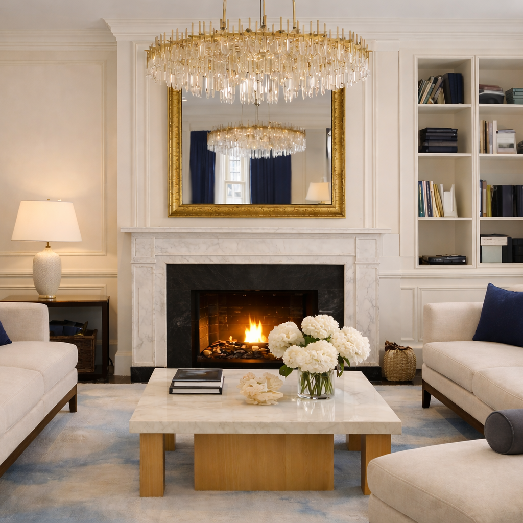 The use of marble, brass, bespoke storage, and decorative lighting reinforces the premium character of the interior, creating a home that feels polished, welcoming, and enduring in style.